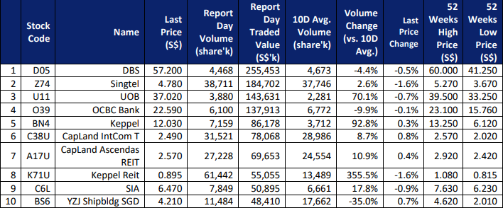 $DBS(D05.SI)$ $Singtel(Z74.SI)$ $UOB(U11.SI)$ $OCBC Bank(O39.SI)$ $Keppel(BN4.SI)$ $CapLand IntCom T(C38U.SI)$ $CapLand Ascendas REIT(A17U.SI)$ $Keppel Reit(K71U.SI)$ $SIA(C6L.SI)$ $YZJ Shipbldg SGD(BS6.SI)$