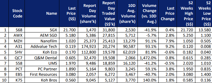 $SGX(S68.SI)$ $AEM SGD(AWX.SI)$ $Nanofilm(MZH.SI)$ $Addvalue Tech(A31.SI)$ $Koh Eco(5HV.SI)$ $Q&M Dental(QC7.SI)$ $UMS(558.SI)$ $PC Partner(PCT.SI)$ $First Resources(EB5.SI)$ $Koh Bros(K75.SI)$