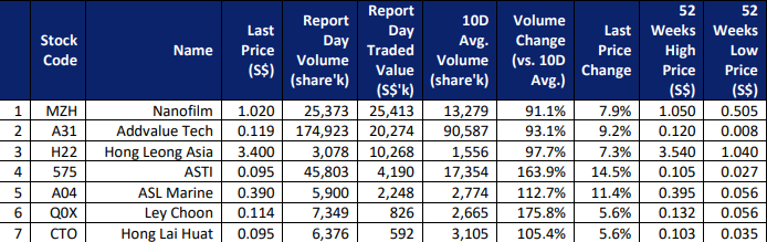 $Nanofilm(MZH.SI)$ $Addvalue Tech(A31.SI)$ $Hong Leong Asia(H22.SI)$ $ASTI(575.SI)$ $ASL Marine(A04.SI)$ $Ley Choon(Q0X.SI)$ $Hong Lai Huat(CTO.SI)$