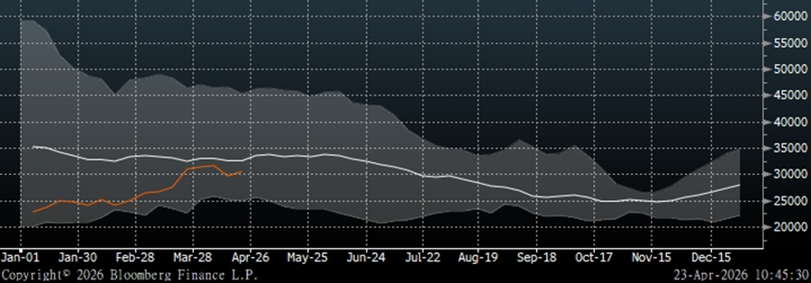 Cushing crude inventories: At Cushing, the main delivery hub for U.S. crude oil, inventories stood at 30.568 million barrels as of April 22, 2026. From the chart trend, Cushing inventories have generally moved higher since the start of 2026, showing that stocks at the delivery hub have recovered from the lows seen at the beginning of the year. However, inventories fell back temporarily last week before rising again in the latest week, indicating that the current restocking process is not a straight-line increase but rather an upward trend accompanied by fluctuations. In terms of historical percentile, the current absolute inventory level is still below the historical average for 2021–2025 and remains in the lower part of the past five-year range, suggesting that although Cushing inventories have improved from earlier levels, they have not yet returned to normal.