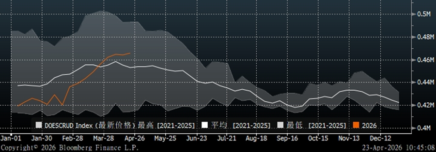 U.S. commercial crude oil inventories: As of April 22, 2026 (the latest data point on the chart), U.S. commercial crude inventories stood at 465.729 million barrels. Judging from the chart trend, the 2026 curve for nationwide U.S. commercial crude inventories (orange line) has continued to rise recently, and since April the overall pattern has still been one of step-like inventory accumulation. From a historical percentile perspective, although inventory levels have recovered to around 466 million barrels, they are still broadly near the middle of the past five-year range, not far from the historical average, and have not yet entered a clearly elevated zone.