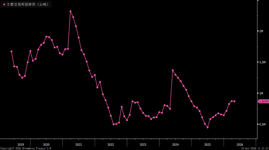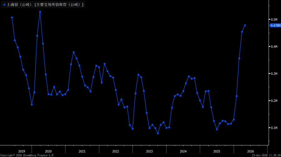 From the marginal changes in the latest week, aluminum inventories across the three major exchanges continue to show clear divergence. COMEX aluminum inventories kept declining, with the latest reading falling to 1,566 tons, indicating that U.S. aluminum inventories are still being drawn down from low levels. LME aluminum inventories also continued to decline to about 0.389 million tons, extending the previous downward trend, showing that the tightness in overseas spot supply has not meaningfully eased. Shanghai aluminum inventories, by contrast, continued to rise to 0.478 million tons, the highest absolute level in five years, indicating that inventory pressure in the domestic market is still building.
