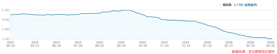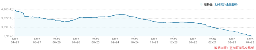 Inventory side (physical fundamentals): As of the latest data on April 22, 2026, COMEX gold inventories stood at 29.55 million troy ounces, while silver inventories came in at 317 million troy ounces. From the historical trend, both have shown an extremely steep long-term downward trajectory. Especially from the second half of 2025 into 2026, the pace of inventory drawdown in both gold and silver has accelerated significantly. At present, the absolute inventory levels of both metals have fallen below all lows recorded during 2021–2025, placing them in the lowest range seen in recent years.