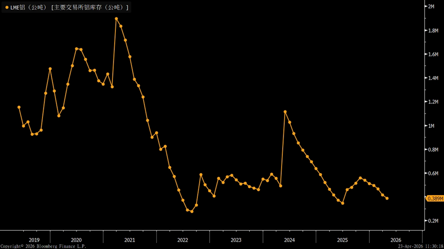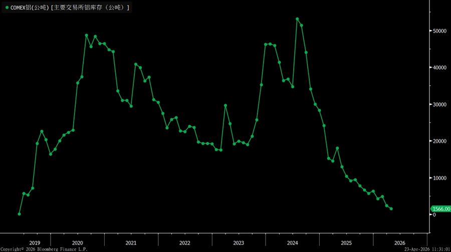 As of April 17, 2026, total aluminum inventories across the three major exchanges stood at about 0.869 million tons (869,000 tons). Of this total, COMEX aluminum inventories were about 1,566 tons, LME aluminum inventories were about 0.389 million tons, and Shanghai aluminum inventories were about 0.478 million tons. In absolute terms, Shanghai inventories remain clearly elevated, while LME inventories, though relatively low, still account for an important share of total inventories across the three exchanges. COMEX inventories, meanwhile, continue to remain extremely low.