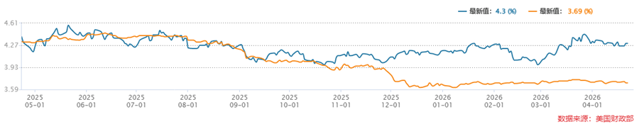On the yield curve, as of the latest data on April 22, 2026, the U.S. 10-year Treasury yield stood at 4.3%, while the 3-month Treasury yield stood at 3.69%. Looking at the most recent movement on the far right side of the chart, within the observation window of the past week, both the short-end 3-month yield (yellow line) and the long-end 10-year yield (blue line) fluctuated within a narrow range, with no clear directional shift overall. Interest rate levels remained relatively stable, while the positive spread between the two narrowed slightly.