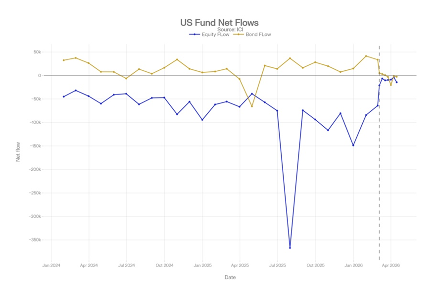 Net outflows from U.S. equity funds increased: For the week ending April 15, 2026, U.S. equity funds posted net outflows of $14.37 billion, remaining in net outflow territory and indicating that the funding environment for equity mutual funds is still weak, with no meaningful improvement in investor sentiment yet.