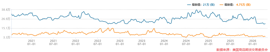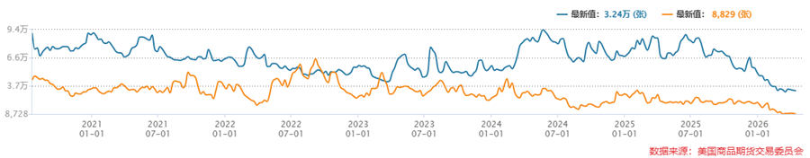 Capital side (positioning): As of the latest available data, COMEX gold non-commercial long positions (blue line) stood at 210,000 contracts, while short positions (yellow line) stood at 47,500 contracts. For COMEX silver, non-commercial long positions (blue line) were 32,400 contracts, while short positions (yellow line) were 8,829 contracts. From a historical percentile perspective, speculative net long positions in both gold and silver (longs minus shorts) have fallen sharply from previous historical highs.
