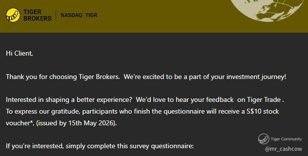 Check your email for Tiger survey! Free S$10 trading voucher!