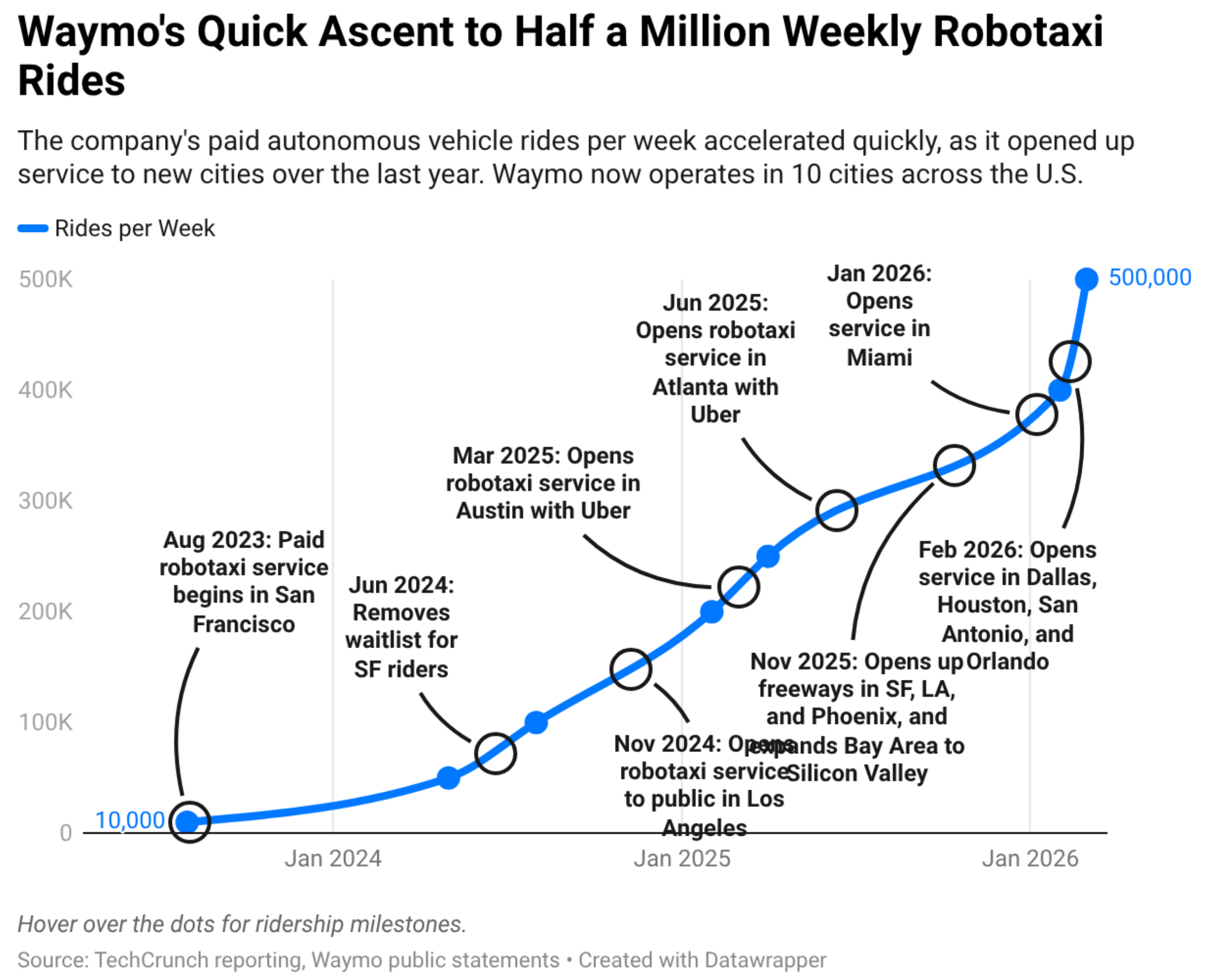 I think Waymo can be a huge success. But it also doesn’t have the ambition to own the market the way Tesla did. If no one else catches up in the next year or two, maybe we will see Waymo continue to scale and get users on its app, reaching a #2 or #3 market share in ride sharing in cities it operates in.