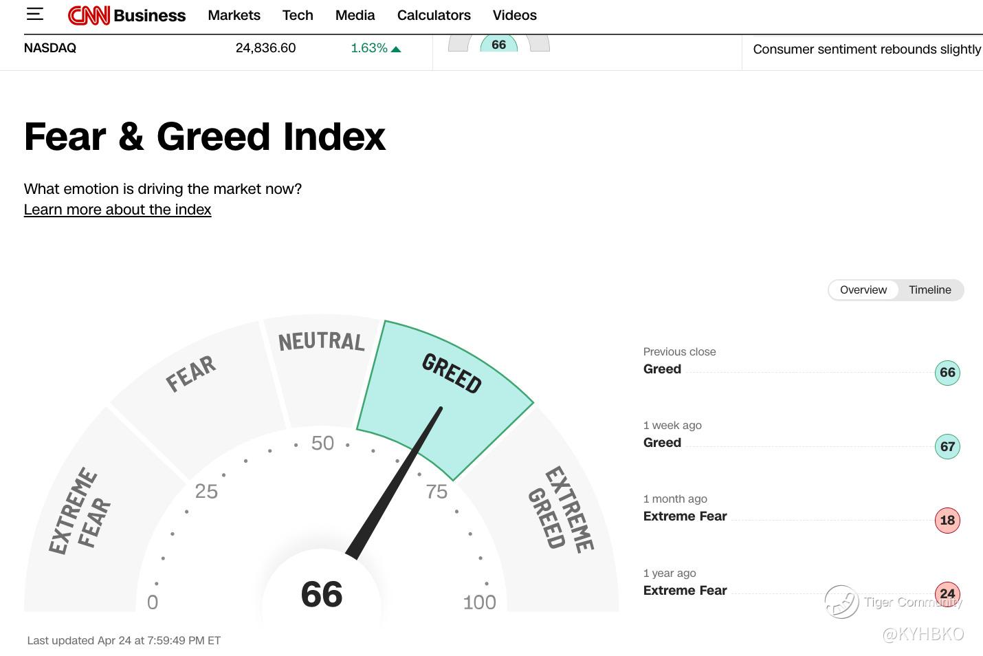 CNN’s Fear & Greed Index remains in the “Greed” sentiment zone with a score of 66 in the index.