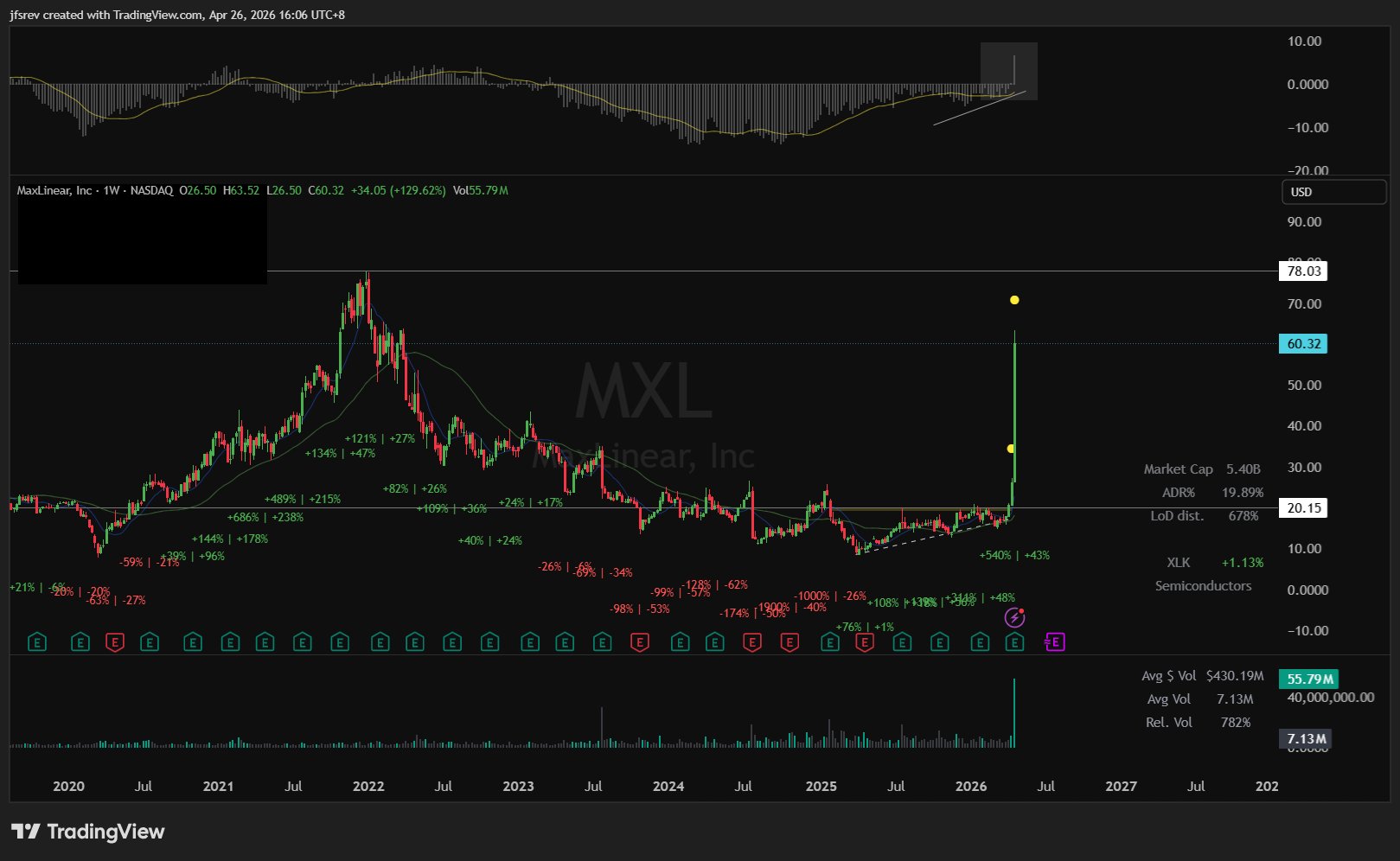 $MaxLinear(MXL)$ (Update) +129% week, less than 2 x ADR% Week from all-time-high