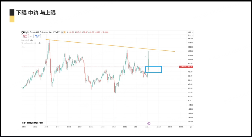 The oil price center is moving higher, as U.S. control is no longer effective and inflationary pressure is gradually increasing. A prolonged stay at medium to high levels is possible, but extreme highs cannot be sustained indefinitely. The key support zone is 70 to 80, the middle range is near 100, and the upper range is around 120, which was a prior high. The lower boundary should not break the year’s early low.