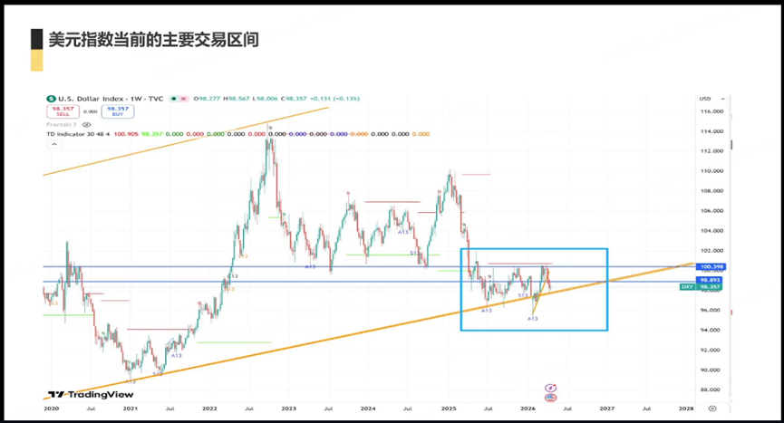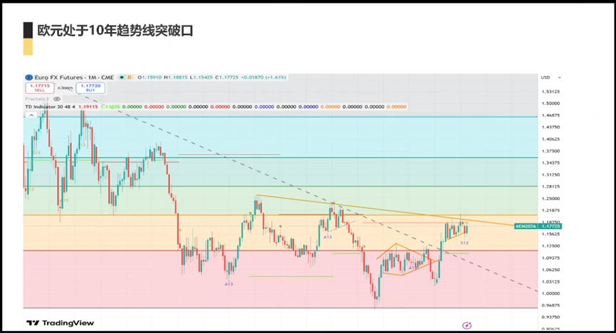 The technical picture has already entered a dangerous zone, and the test of the ten-year cycle downtrend line must be watched carefully. The euro’s first-quarter attempt did not hold, but the opportunity still exists. Cheng Jun reminded viewers that the dollar has not yet truly accelerated lower, and the next phase depends on how the situation unfolds.