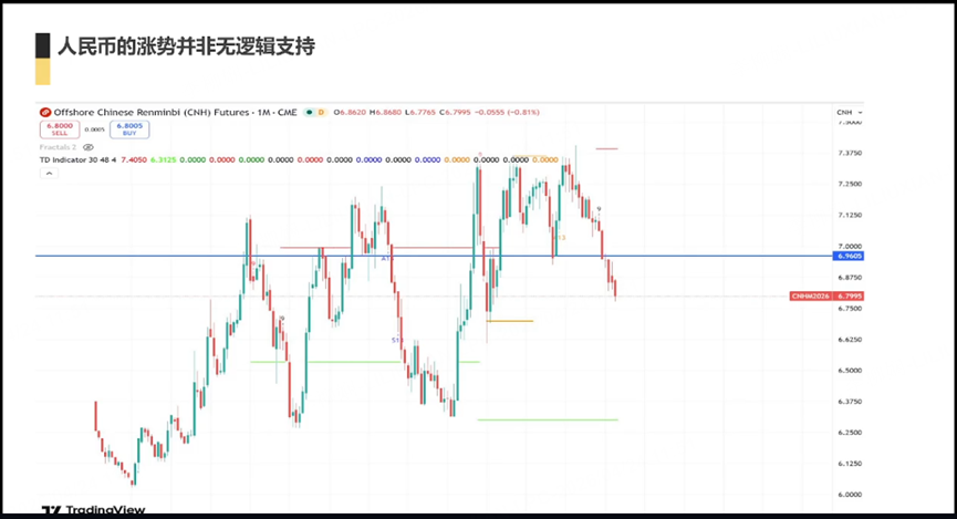 Dollar assets mainly include the Dollar Index, U.S. Treasuries, and U.S. equities, with U.S. stocks serving as the last fortress. Treasury yields, when viewed inversely, reflect the market’s level of acceptance. Cheng Jun held a pessimistic view and laid out the logic for being long non-U.S. currencies from three angles: technical weakness, fundamental instability, and market logic, all working together to push the dollar lower.