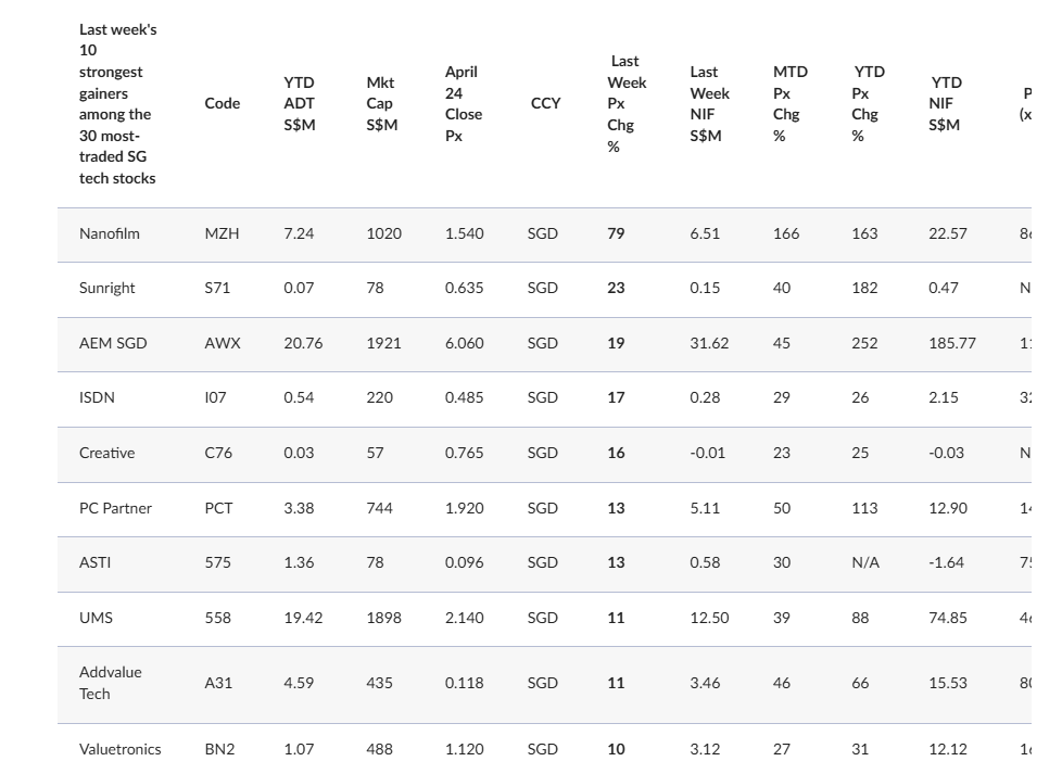 $Nanofilm(MZH.SI)$ $Sunright(S71.SI)$ $AEM SGD(AWX.SI)$ $ISDN(I07.SI)$ $Creative(C76.SI)$ $PC Partner(PCT.SI)$ $ASTI(575.SI)$ $UMS(558.SI)$ $Addvalue Tech(A31.SI)$ $Valuetronics(BN2.SI)$