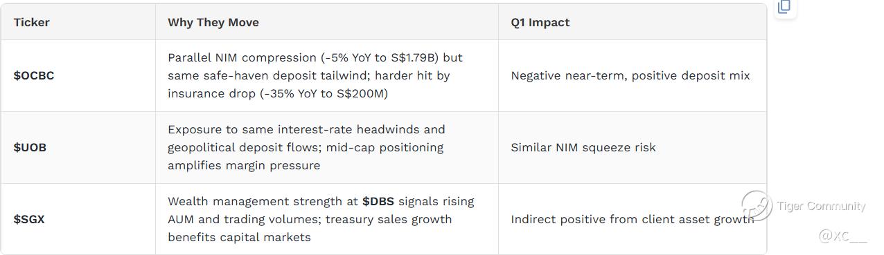 β’ Q1 Net Profit: S$2.89 billion β beats Bloomberg consensus (S$2.88B) and UOBKH projection (S$2.83B); -2% YoY but +25% QoQ from Q4 2025 β’ Record Pre-Tax Profit: S$3.44 billion β the real story; tax headwinds (15% global minimum tax) account for profit decline, not operational weakness β’ NIM Compression to 1.93% β down from 2.12% YoY due to lower Singapore/HK rates, but offset by safe-haven deposit boosts and no Q1 Fed cuts yet β’ Wealth Management Strength β drove record full-year 2025 total income of S$22.9 billion (+3% YoY); treasury sales remained seasonal-strong despite overall profit dip β’ Safe-Haven Flows Accelerating β Middle East geopolitical tensions driving deposit inflows across $DBS, $OCBC, and $UOB, reshaping liability mix favorably