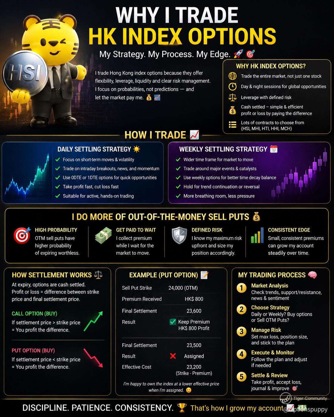 I trade HK index options because they provide broad market exposure, flexible trading hours, leverage, and efficient cash settlement. They allow me to profit from rising markets, falling markets, or even sideways markets through premium-selling strategies.