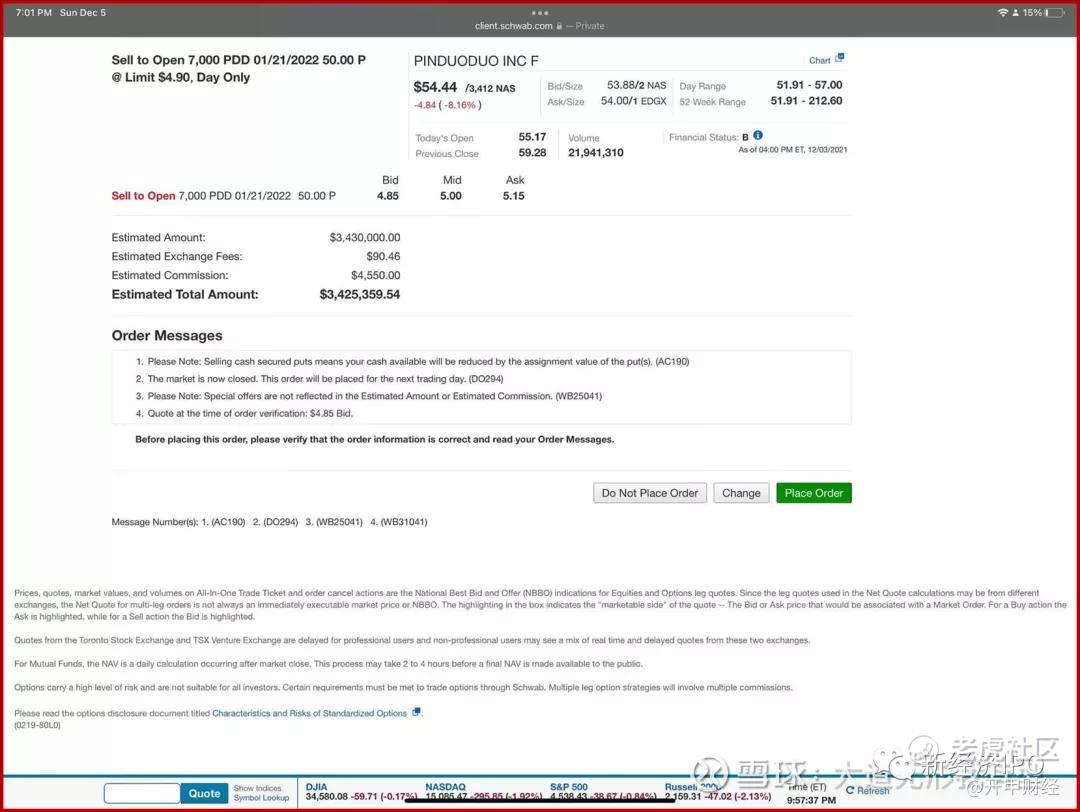 從截圖看,段永平是在12月3日下單賣出於2021年1月21日到期的、行權價50美元的拼多多看跌期權,段永平一共賣了7000張,按每張100股計算,一張可以收穫權利金4.9美元×100=490美元,7000張就是343萬美元(約合2179萬元人民幣)。如果屆時需要行權的話,則段永平需要支付3500萬美元(約合2.22億元人民幣)買入70萬股拼多多的股票。