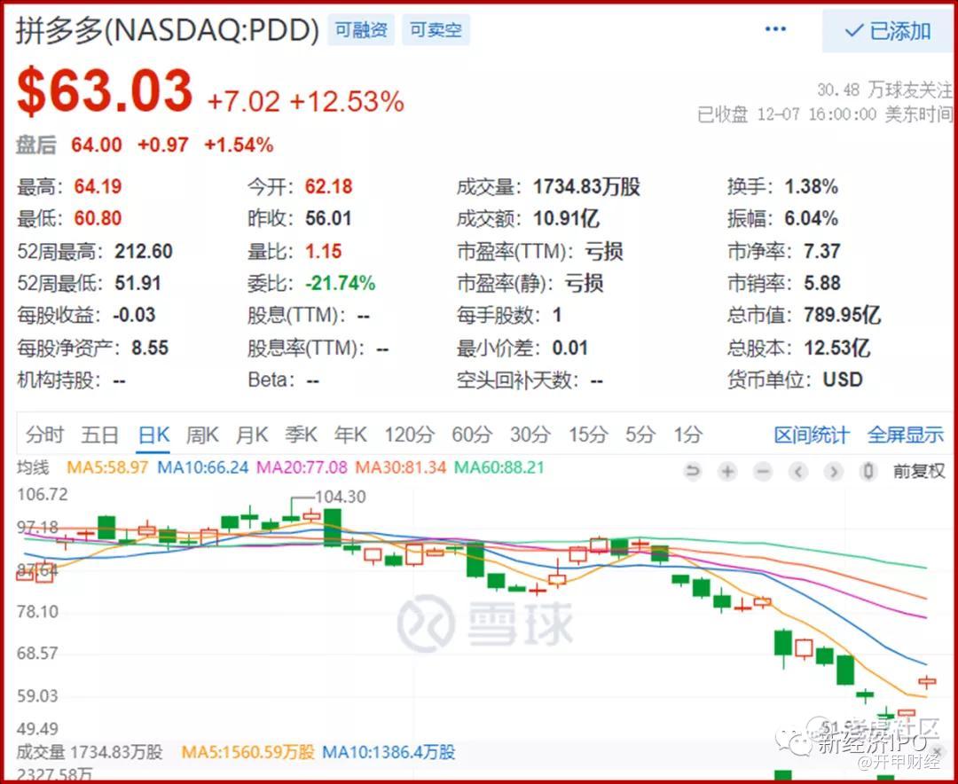 拼多多股價十多天內暴跌40%多,在段永平抄底後,開始反彈。