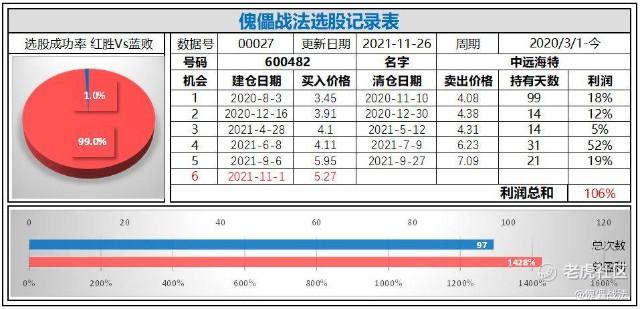 到目前爲止,一共更新了27只股票,共有97次買入機會,成功率99%,累計利潤1428%(收益率僅供參考)。
