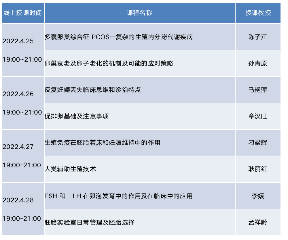 爲積極促進生殖醫學的發展,賦能和培養專業人才,搭建行業專家與廣大醫務工作者交流學習的平臺,錦欣集團旗下錦欣學苑組織和發起了生殖專業知識專家授課班,攜手8位行業大咖於2022年4月25日至4月28日,在線精彩呈現。