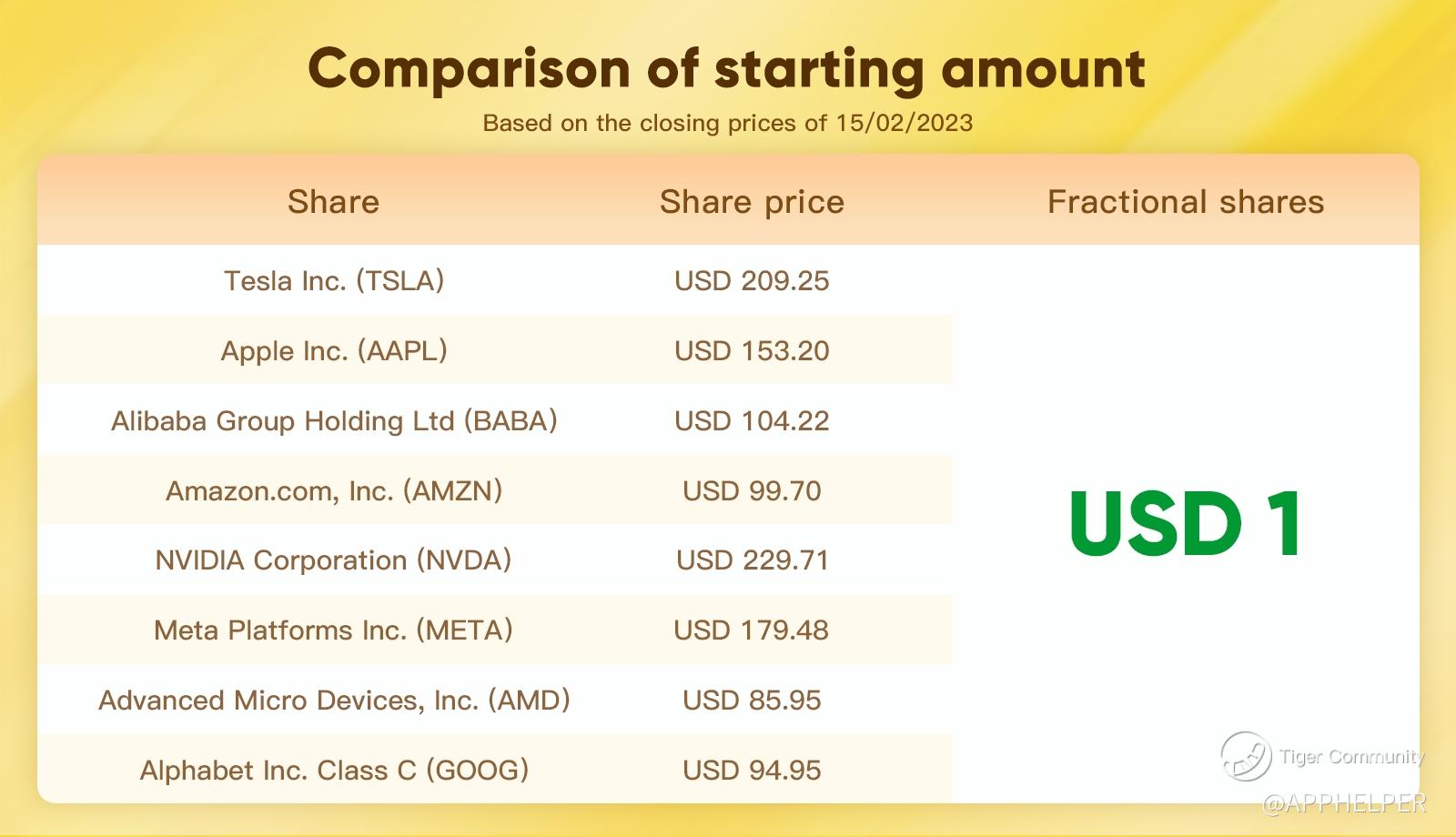 πππGood news! With Tiger Trade, you can buy fractional shares from S&P 500 listed companies and other US stocks for just USD 1.