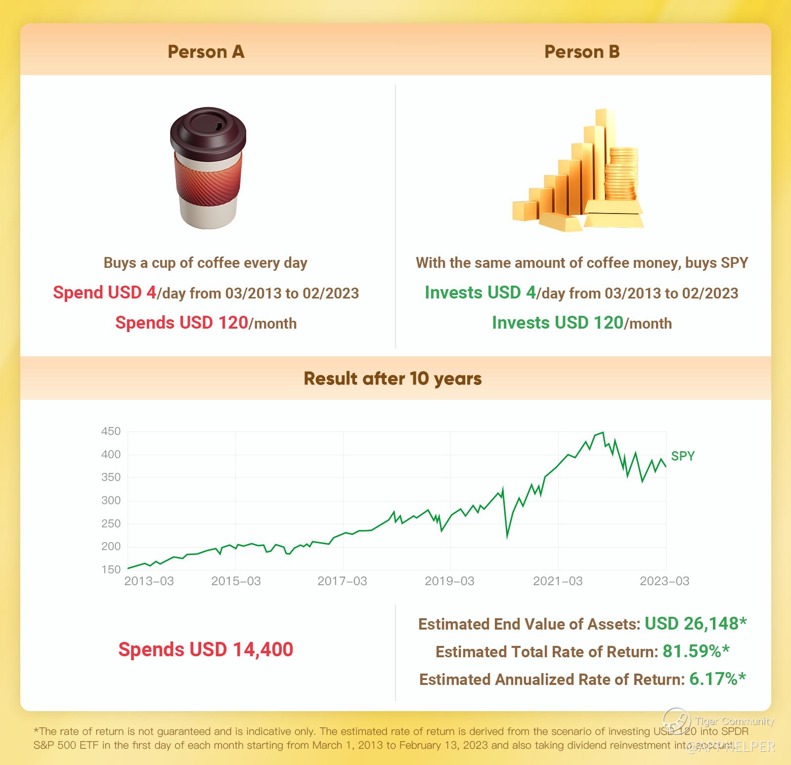 Additionally, by combining fractional shares with our auto-investing feature, you can make a bigger impact on your overall investment portfolio.Imagine if we used the money for a cup of coffee to buy a coffee company's stock instead. What would happen if you invested your coffee money first for one year, then eventually for 10 years?
