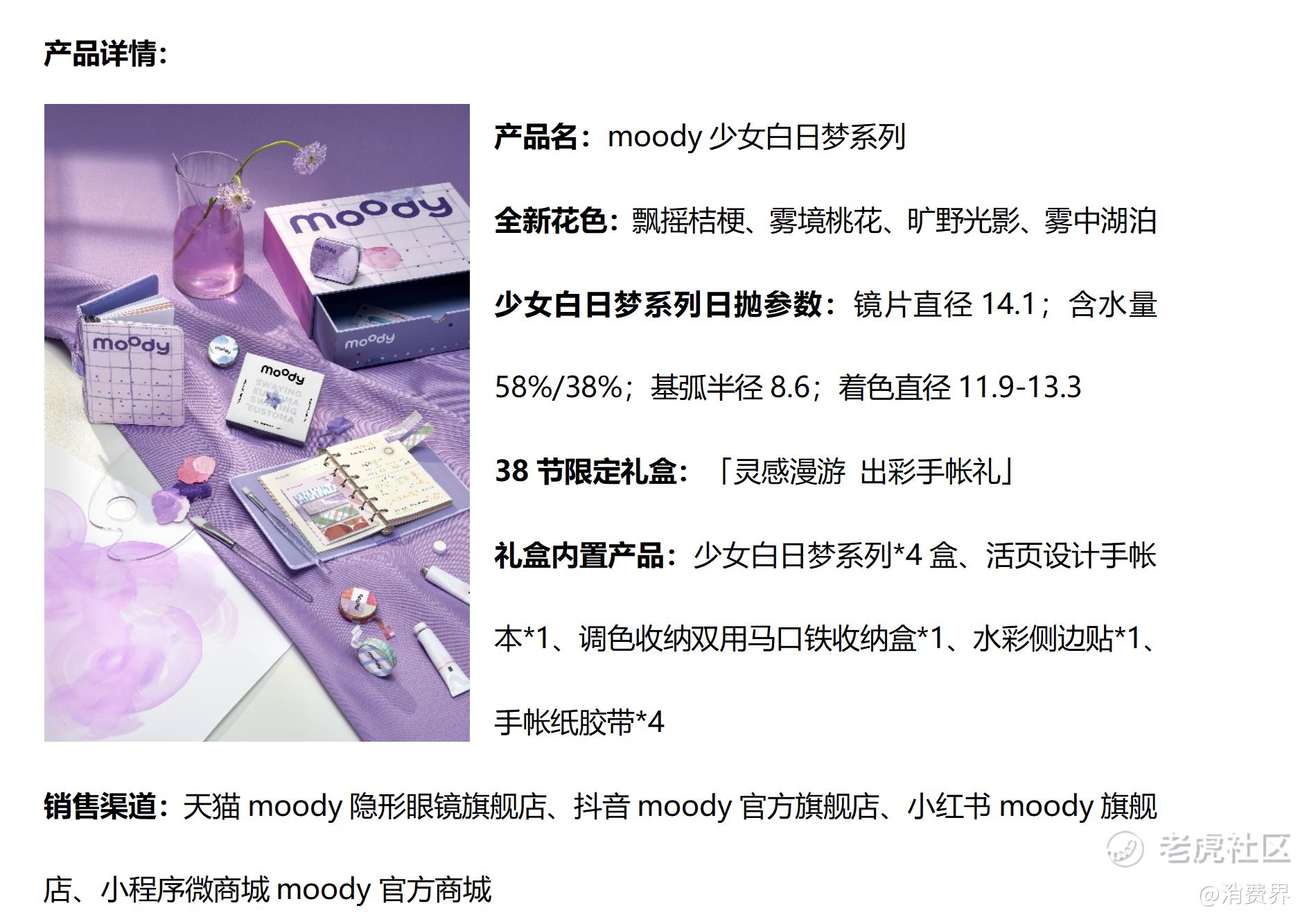 38節來臨之際,彩瞳頭部品牌moody少女白日夢日拋系列推出春日「水彩感」新色,以水彩爲靈感,將春日色彩定格眼眸之中,並推出「靈感漫遊 出彩手帳禮」限定禮盒,打造出彩少女感。