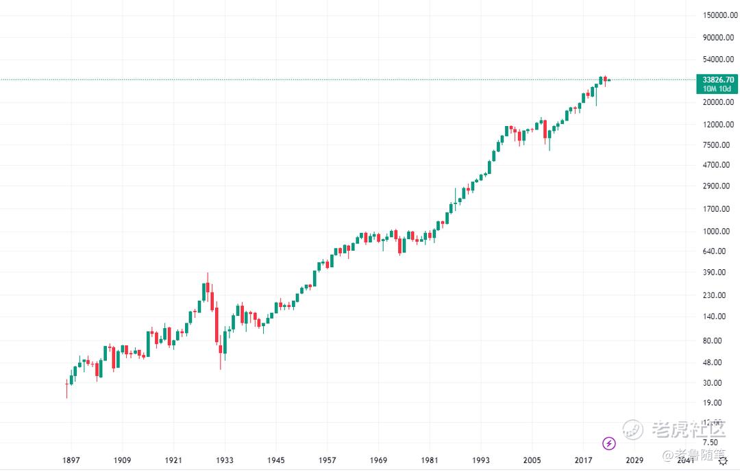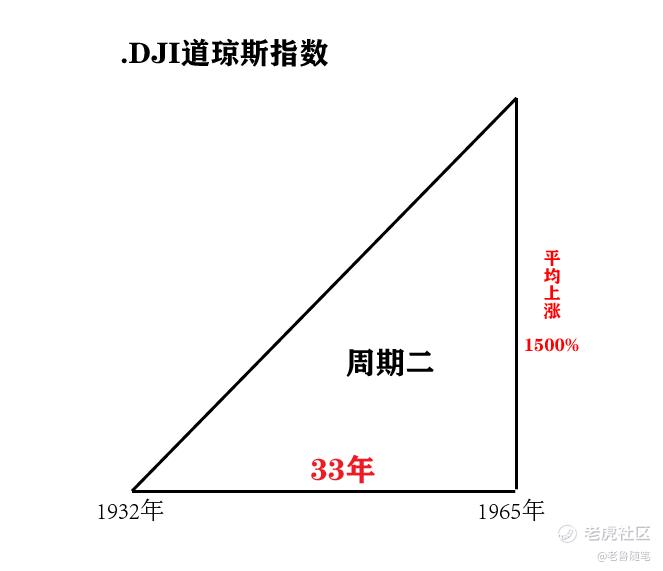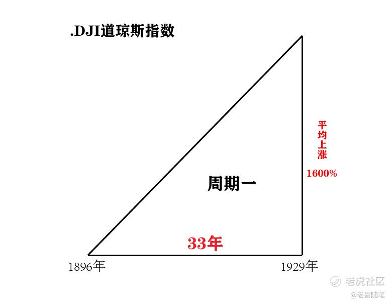 我可以看到,第一輪週期是從1896年到1929年,經歷了33年,道瓊斯指數從最低20點上漲到380點,平均上漲百分比爲1600%