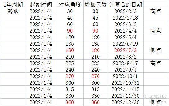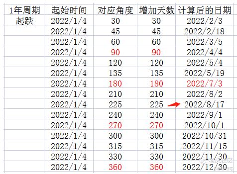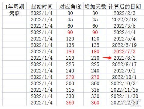 這個時候就可以參考一下時間週期的表格了,我們以下一個角度作爲可能會出現的時間高點,也就是2022年8月2號,距離7月3日剛好一個月的時間,30天左右