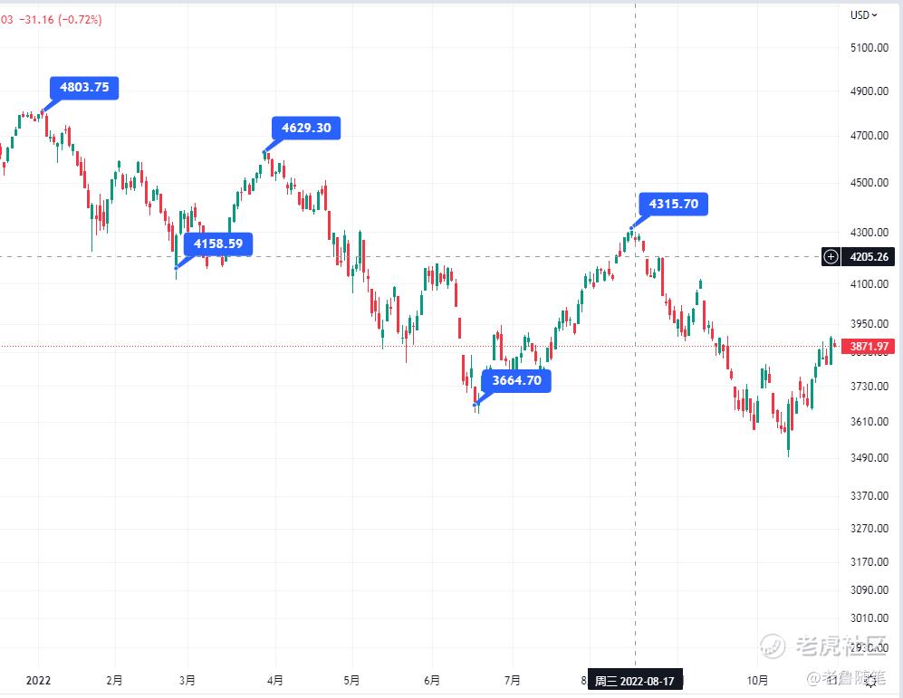 最終通過覆盤後發現,這一輪反彈的最高點是4300點左右,比我們預期的高點高100點,時間上在2022年8月16日見頂,我們的時間週期圖上有一個日期僅僅相差一天