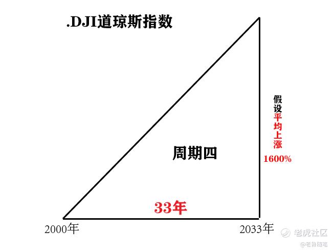 第四輪週期是從2000年到2033年,這個週期也是我們目前所處的位置2023年,距離2033年還有10年的時間,本輪週期道瓊斯指數低點是8000點,那我們做一個假設,假設第四輪週期上漲幅度與前面三輪週期相同,那麼在2033年,道瓊斯指數將會到達12w附近的點位,目前點位數才3.3w,還有4倍多的空間