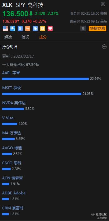 我們就拿XLK高科技這個行業指數來看,他裏面十大持倉是蘋果、微軟、英偉達這些企業。