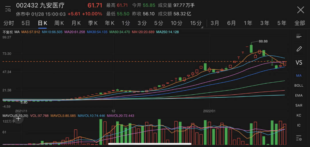 這樣想,貌似簡單了,直接拉出最近的妖股排行榜,定睛一看-九安醫療,48個交易日,10倍漲幅,宛若羅納爾多一屆世界盃、7場比賽,輕輕鬆鬆刷了50個進球。