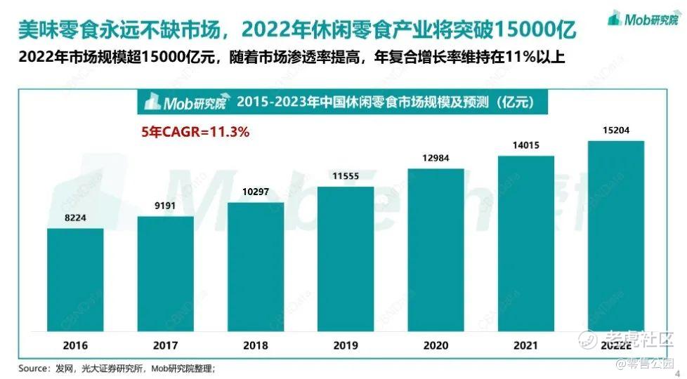 Mob研究院披露的《2022中國休閒零食行業研究報告》顯示,2021年,中國休閒零食行業市場規模爲14015億元,5年CAGR爲11.3%。預計2022年,中國休閒零食市場規模突破15000億元。