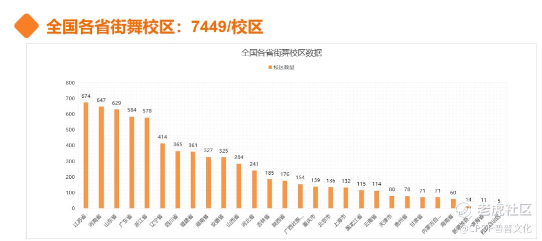 據2023年1月統計數據顯示,全國街舞機構共計約7449家。其中,江蘇、河南、山東、廣東、浙江街舞機構數量位居前五。