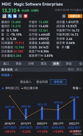 Magic Software Enterprises(MGIC) 5年來營收、營業利潤和淨利潤均保持連續增長,平均增速分別爲17.1%,18.8%和21%,2022年增速分別爲18%,14.1%和33.3%。