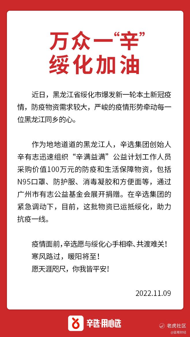 黑龍江青年企業家辛有志在得知綏化疫情後,組織辛選團隊主動聯繫**黑龍江省委,根據當前綏化市疫情防控急需生活保障物資的需求,辛選迅速採購價值100萬元的防疫和生活保障物資,包括N95口罩、防護服、消毒凝膠和方便麪等,緊急馳援綏化。
