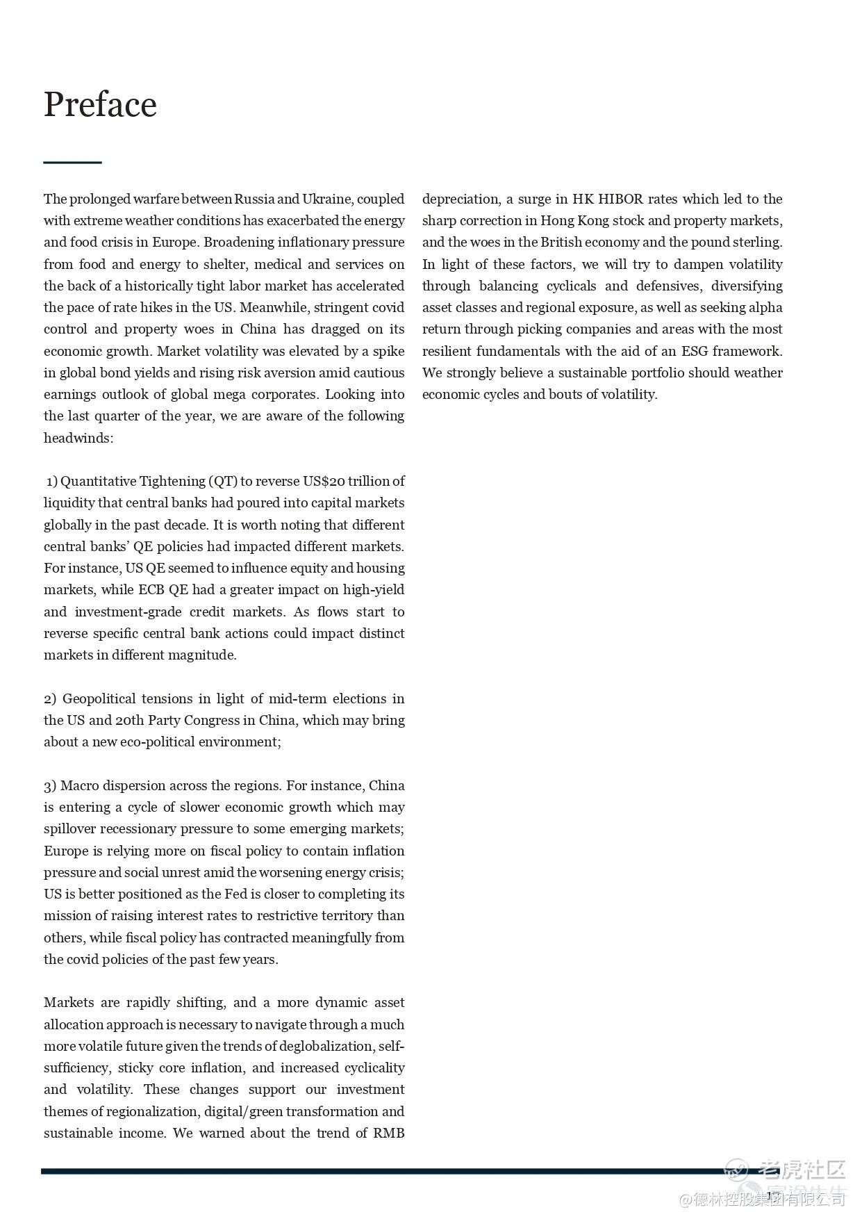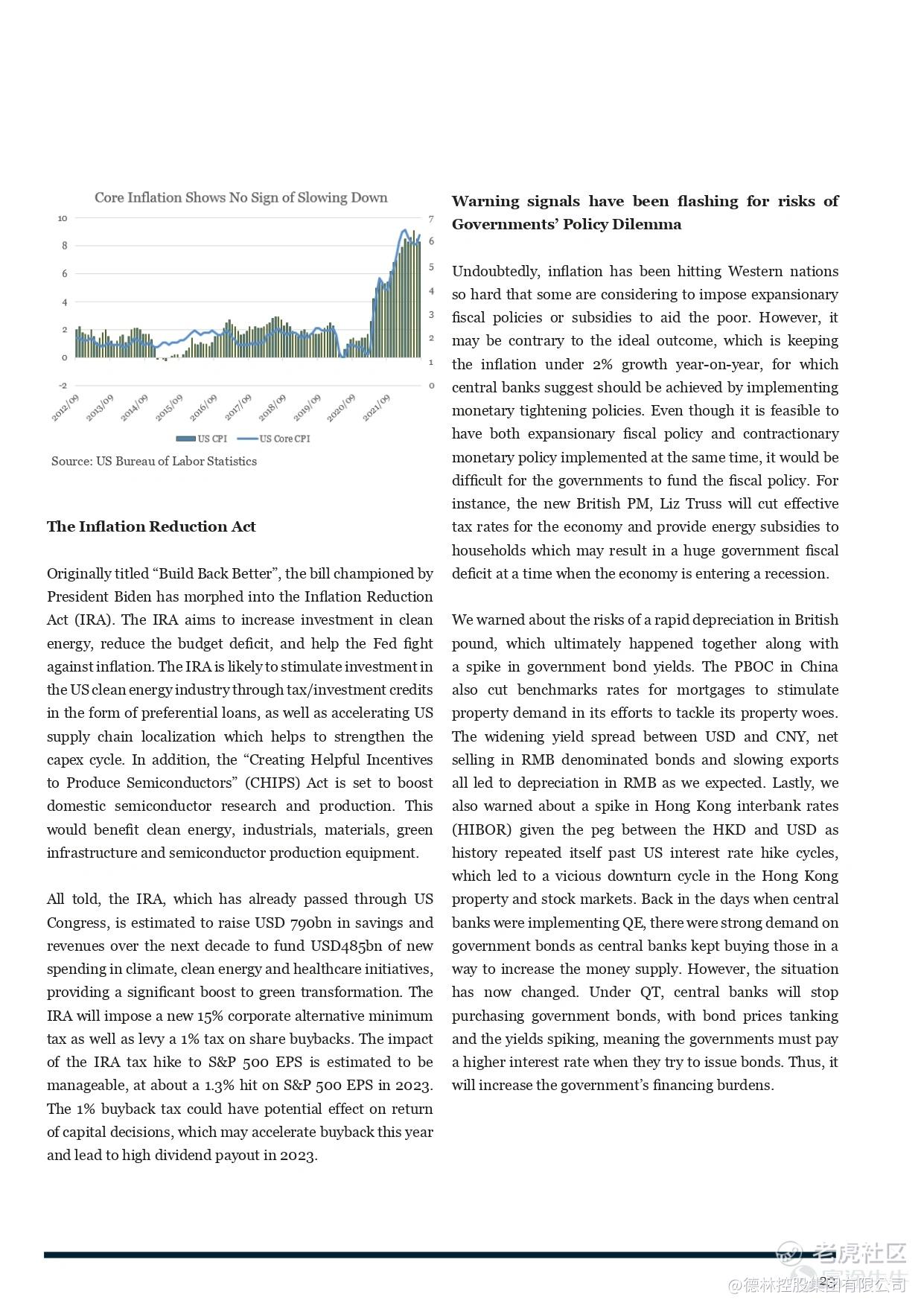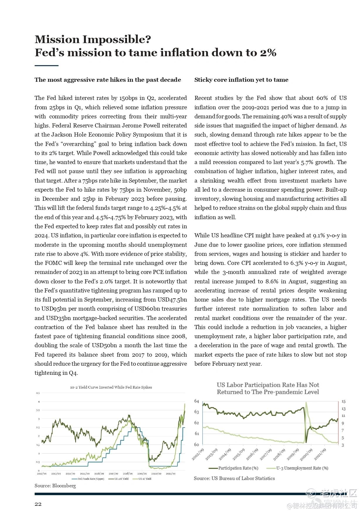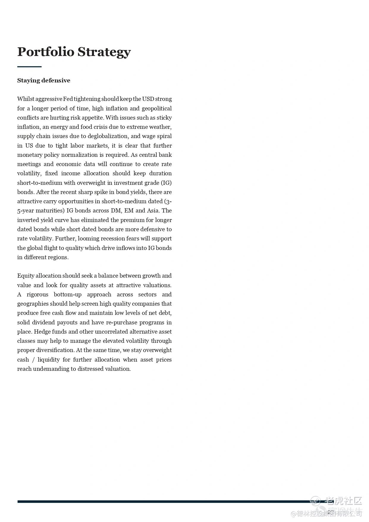 The prolonged warfare between Russia and Ukraine, coupled with extreme weather conditions has exacerbated the energy and food crisis in Europe. Broadening inflationary pressure from food and energy to shelter, medical and services on the back of a historically tight labor market has accelerated the pace of rate hikes in the US. Market volatility was elevated by a spike in global bond yields and rising risk aversion amid cautious earnings outlook of global mega corporates.In terms of portfolio strategy, we suggest investors staying defensive. Fixed income allocation should keep duration short-to-medium with overweight in investment grade (IG) bonds. Equity allocation should seek a balance between growth and value and look for quality assets at attractive valuations. At the same time, we stay overweight cash / liquidity for further allocation when asset prices reach undemanding to distressed valuation.