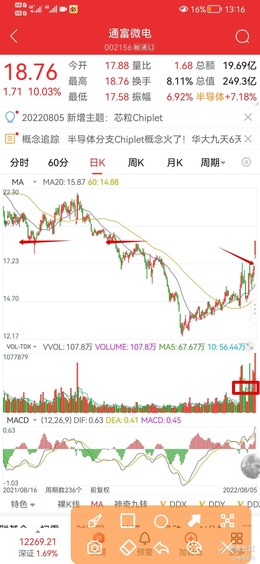 1.我們可以看到4月末到現在,不論K線還是還是量能,不是很活躍,也就是資金參與的熱情度不夠。
