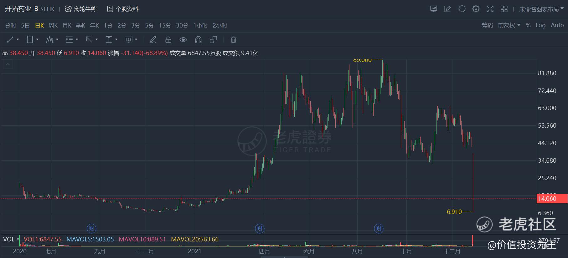 今日,小型創新藥企業開拓藥業給投資者帶來一份70CM的血腥震撼,股價在一日之內,從45.2元下跌至14元!