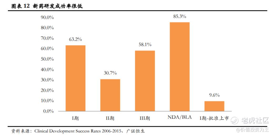 根據BIO公司《Clinical Development Success Rates 2006-2015》的報告,臨牀I、II、III期的成功率分別爲63.2%、30.7%和58.1%,NDA/BLA到獲得批准爲85.9%。整體來看,從I期到獲得批准的成功率僅爲11.9%。