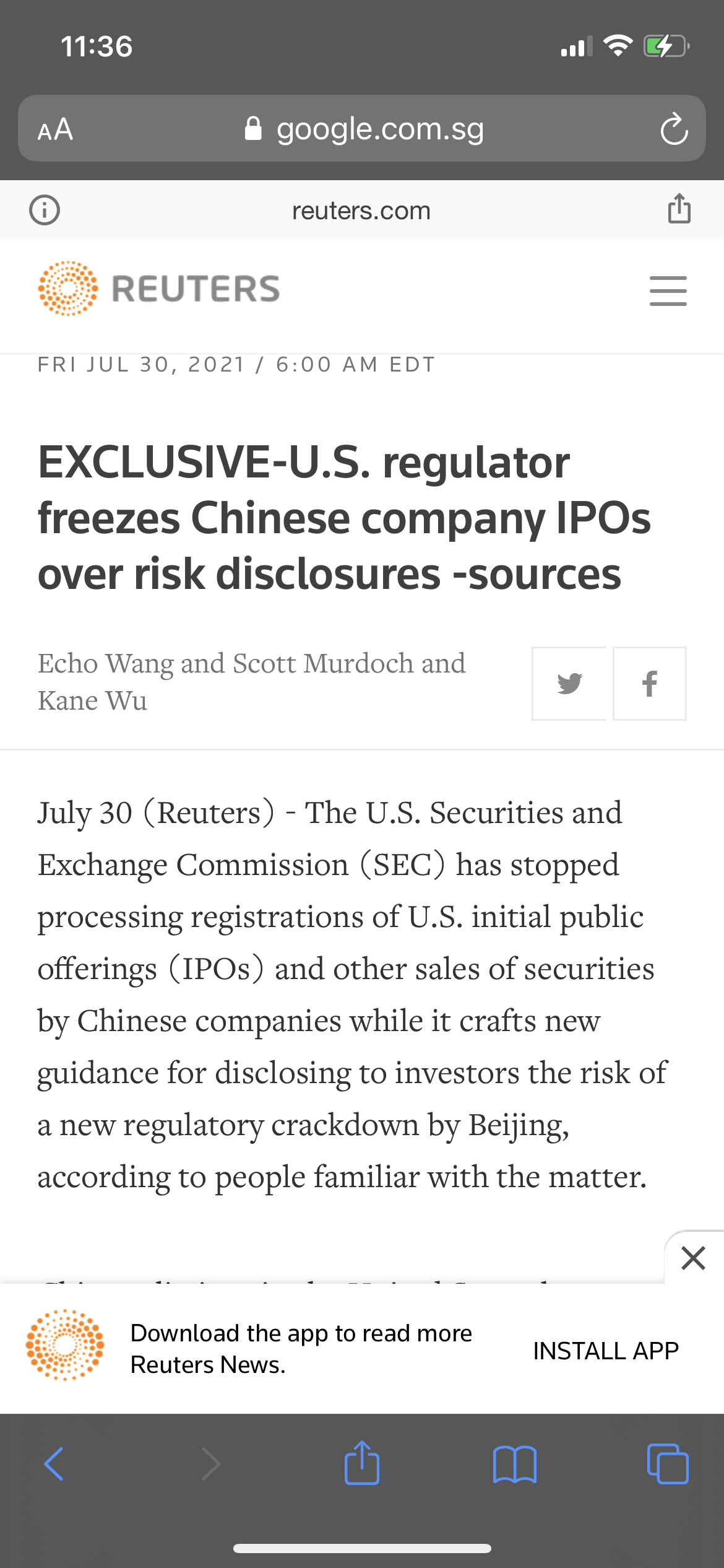 $DiDi Global Inc.(DIDI)$this is the news articleon Reuters that says SEC stop processing Chinese IPOs for now. This is because they are scared that China will keep changing their policies so disclosure must be given.