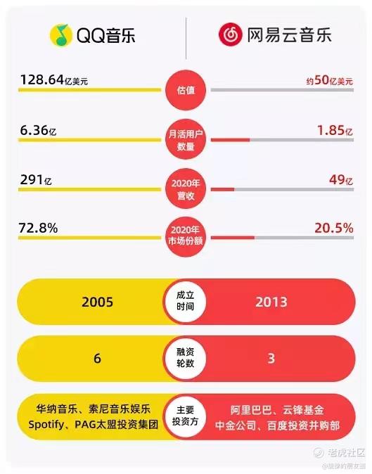 QQ音樂:的市值爲128億美元、月活6.36億、2020年營收291億、淨利潤16.71億、 市場份額72.8%