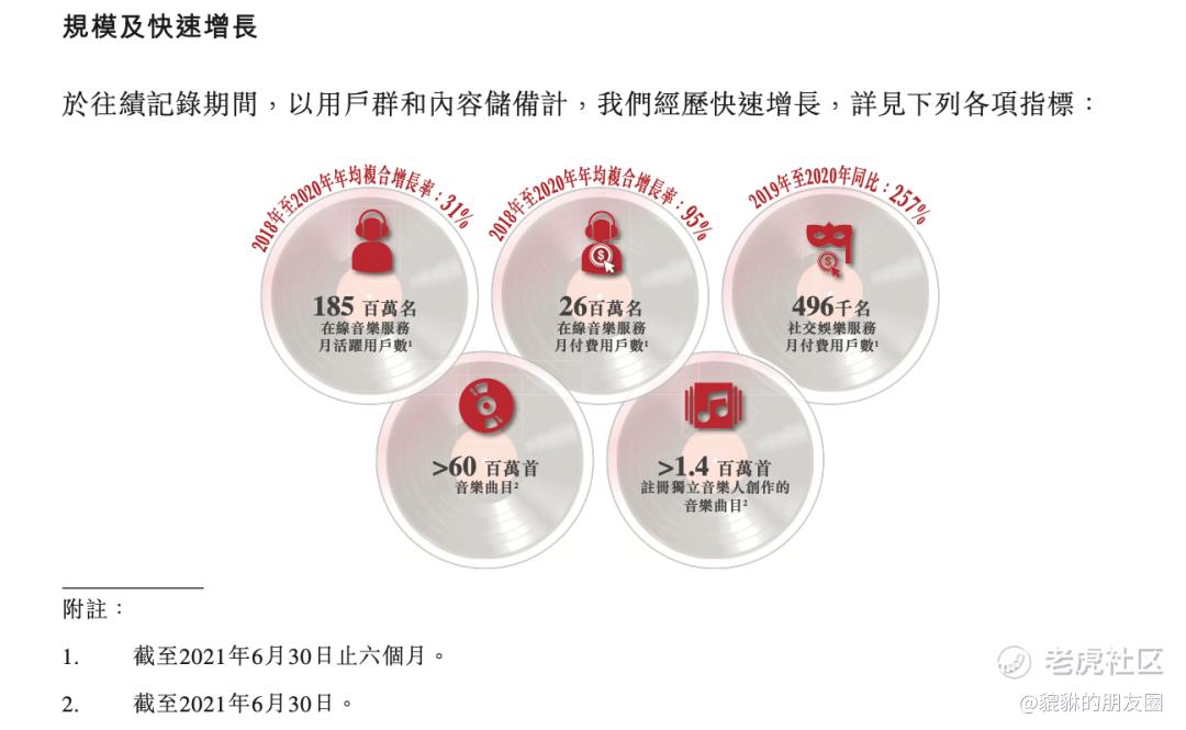 於往績記錄期間,以用戶羣和內容儲備計,公司經歷快速增長。截至2021年6月30日,平臺月活用戶達到1.85億人,每名日活躍用戶於平臺每天平均花費約76.9分鐘聽歌。