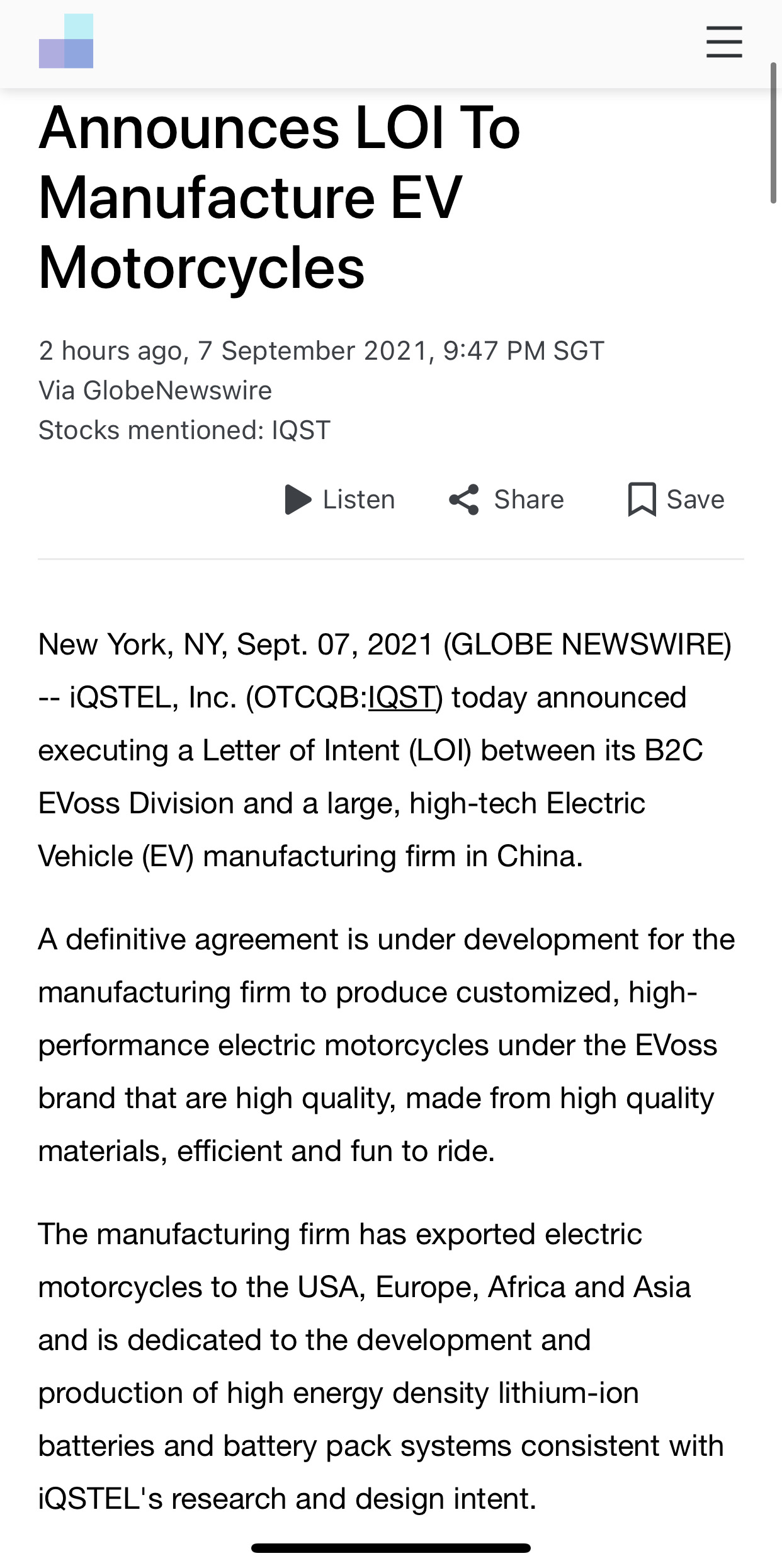 $iQSTEL Inc.(IQST)$Letter Of Intent to Manufacture Ev Motorcycles