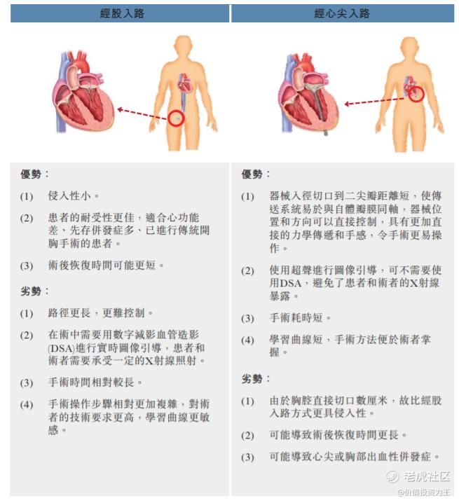 經導管二尖瓣修復是一種基於導管的技術,通過不涉及開胸手術的介入手術修復二尖瓣。目前主要有兩種方式,經心尖和經皮入路(目前主要指經股入路),下圖是兩種方式優劣勢對比: