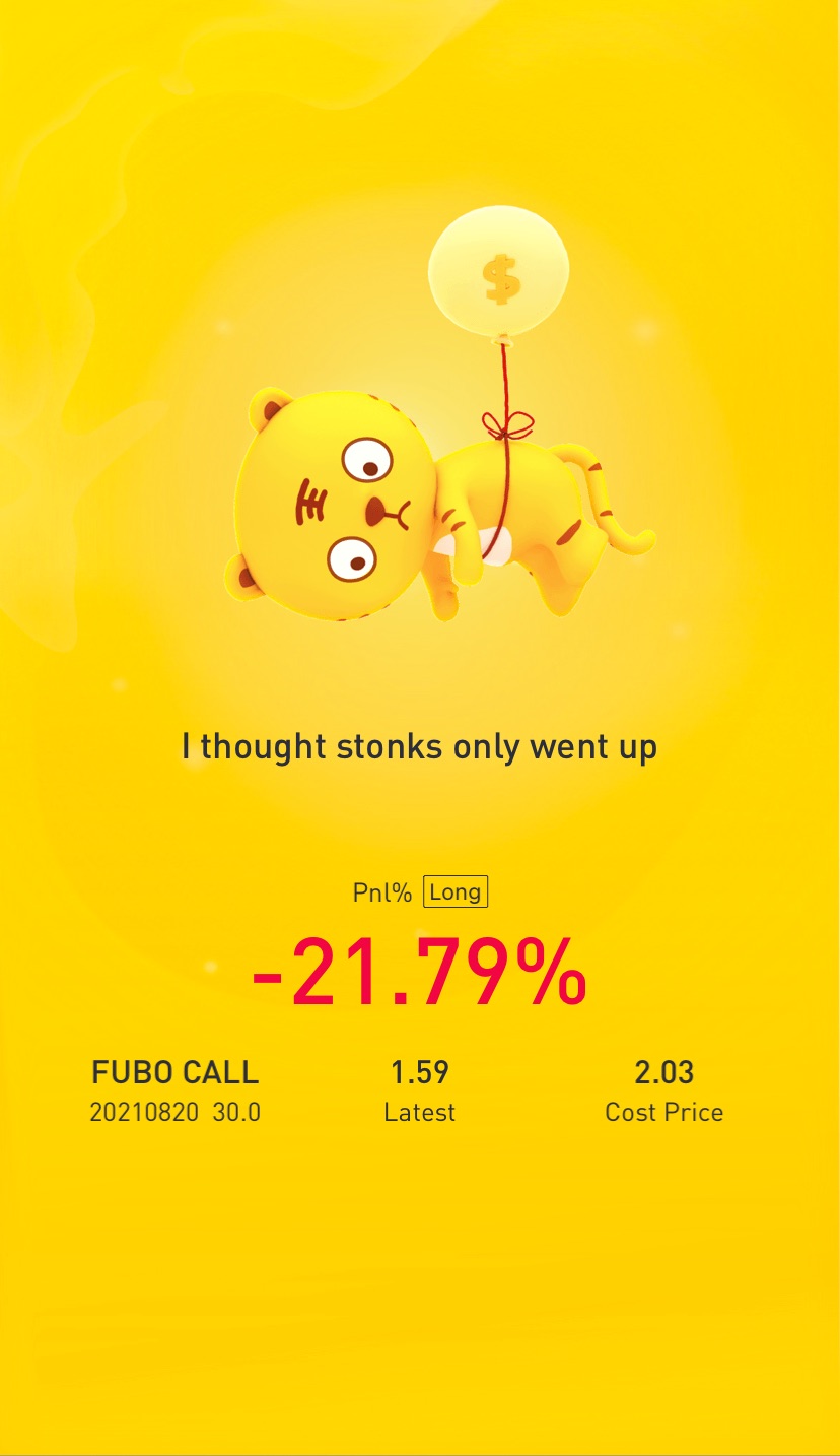 $FUBO 20210820 30.0 CALL(FUBO)$Loss reduced from -50% to -20%. Hoping for good price action today to turn this green!