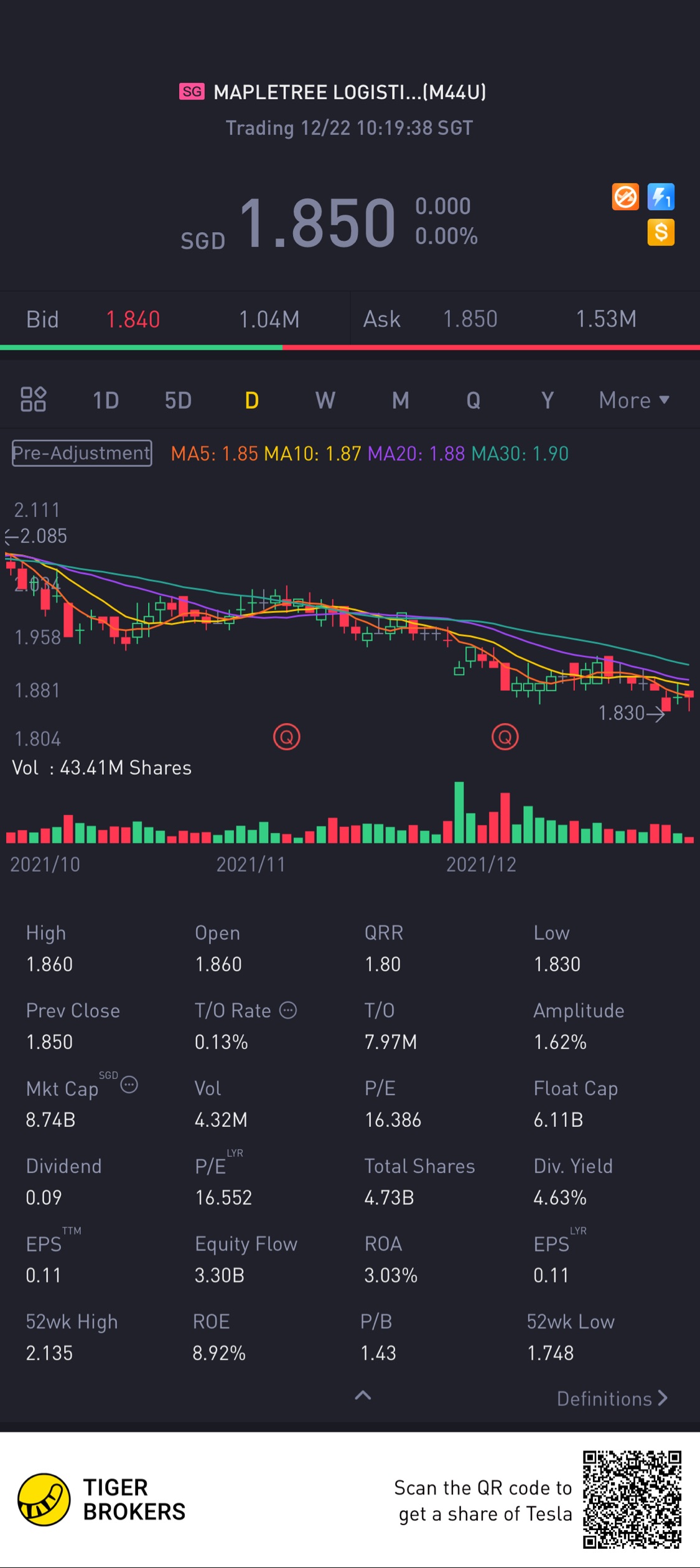 $MAPLETREE LOGISTICS TRUST(M44U.SI)$$1.83 would be a good price to buy, shall be patient and accumulate for dividends