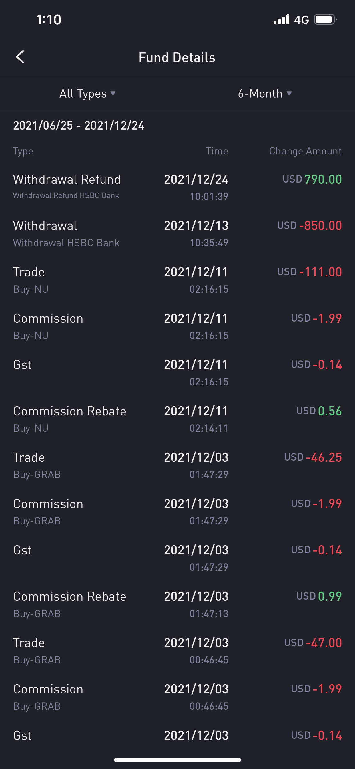I'm trying to do a withdrawal on 13/12/2021 for my own sweet Christmas gift who's know the telegraphic transfer did not a**ected my bank HSBCdue to the purpose of transfer did not listed clearly which are not filled by me. Now I wait for such a long period keep tracking with the fund and this morning the fund finally reached back into my tiger broker balance but with a deduction of 60 USD , this is the worst experience I had faced. I'm using Interective broker and etoro as well and I never faced this kind of withdrawing problem before. I'm afraid the next withdraw I'm going to do will face the same problem and all the balance of my will not able to get back by me and I have to bear all the transection fees until my account runniny out of balance?! Hiazzzz